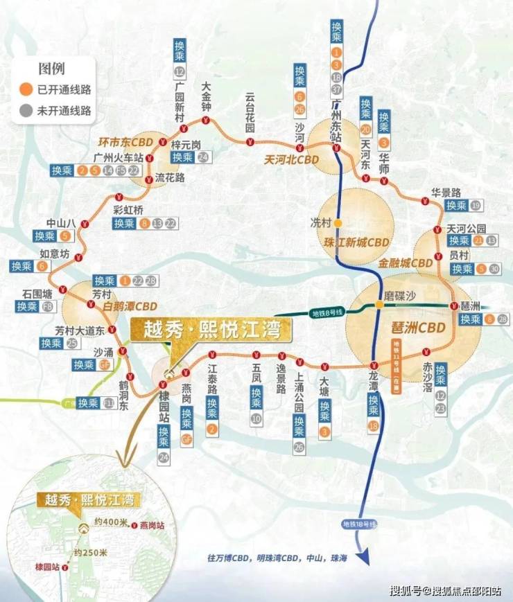 项目距离广佛线燕岗站直线约400米,步行大概需要600米左右,走去地铁站约10分钟左右,距离11号线棣园站直线约250米,步行需要600米左右,大概8分钟左右,算是个妥妥的双地铁盘,均可不换乘直达珠金琶。