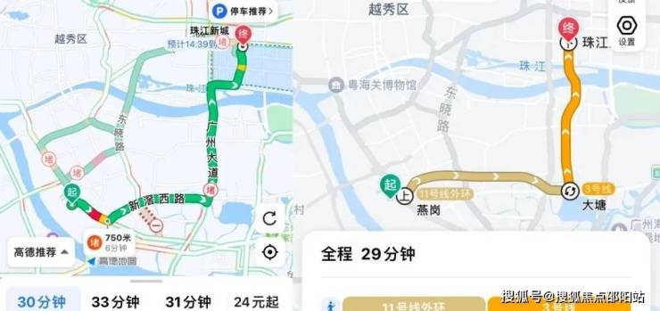 如果是去珠江新城的话,开车大概12公里,花费30分钟左右即可抵达,坐地铁的话,11号线转3号线,全程8个站,耗时29分钟左右。