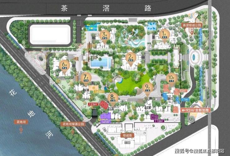 将新建16个高端住宅社区,2间学校和3间幼儿园,以及合计60万㎡高端商业,内部规划“一心三脉”四大组团。