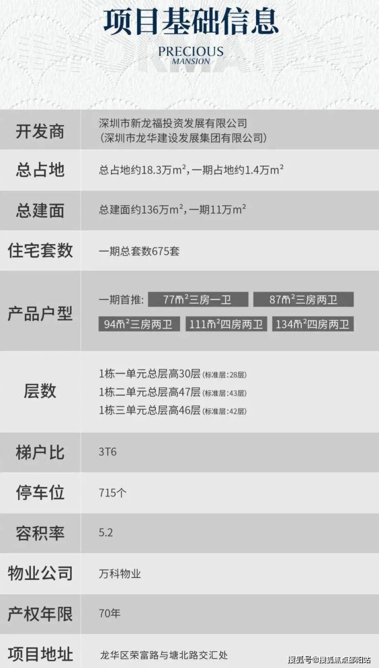 位于深圳市龙华区福城街道荣富路与塘北路交汇处的玖珑瑧境·新玥(备案名:福城境未来家园),作为龙华区属国企龙华建设集团成立十一载以来倾力打造的首个住宅“壹号作品”,正凭借其“龙华重点片区九龙山数字城核心占位+华为等三大千亿产业矩阵环绕+136万方产城融合大城首发”三重核心禀赋,成为2026年深圳楼市中极具关注度的品质标杆--2。该项目由深圳市新龙福投资发展有限公司(龙华建设集团全资子公司)开发建设,作为集团首个商品住宅项目,龙华建设集团依托其土地整备、城市更新、保障房建设等全链条城市运营经验,将国企的稳健与审慎熔铸于项目细节品质之中-1。项目一期占地面积约1.41万平方米,总建筑面积约11.03万平方米,整体规划为3栋高层住宅(1栋1单元30层,1栋2单元47层,1栋3单元46层),共计675户,其中可售商品房仅集中在1栋1单元约167套,其余为回迁房-19-16-11。项目容积率5.2,绿化率高达40.03%,采用3梯6户设计,层高约3米,车位配比约1:1.06(715个地下车位),由连续十年蝉联行业百强NO.1的万科物业提供4.95元/平方米·月的专业化服务,为业主的长期居住品质提供了坚实的“国企开发+万科服务”双保险-3-11-1。项目于2026年3月19日取得预售许可证,3月29日迎来盛大开盘,首开当天即推出“冻资钜惠”政策,单价低至30300元/㎡起,首付36万起,总价236万起,以极具诚意的价格策略迅速点燃市场热度--2。当前市场参考价格方面,根据2026年4月最新数据显示,项目备案均价约36567元/㎡,较周边新房低约3066元/㎡,但较周边二手房贵约2213元/㎡,在专业机构的楼盘价值多维度分析中,项目综合评分高达8.9分,其中项目户型9.0分、生活配套满分10.0分、教育配套8.8分、交通配套8.6分,充分印证了市场对“国企品质+新规产品+产业红利”组合的高度认可-3。