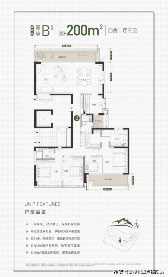 同样的专梯入户,豪宅感扑面而来,该户型为顶级大户型,四阳台设计,最大有10.55米的景观阳台和180度视野的餐客厅空间奢阔气场尽显,罕见的南北瞰景四阳台设计,让家的每个角落都能欣赏美丽的山景和城市景观。所有的开窗面都尽可能放大,客餐厅、书房、卧室、几乎都能享受超宽超大屏