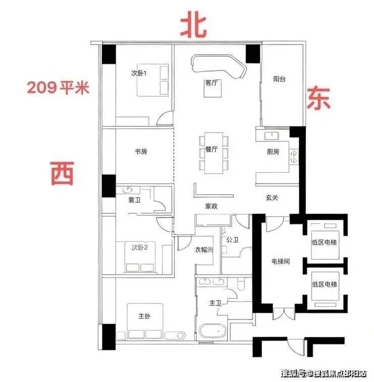 首先这是个标准的四房三卫(双套间),横厅设计,阳台朝东,落地窗朝北,房间朝西。阳台客厅与次卧1形成通透,整屋拥有四面采光面。