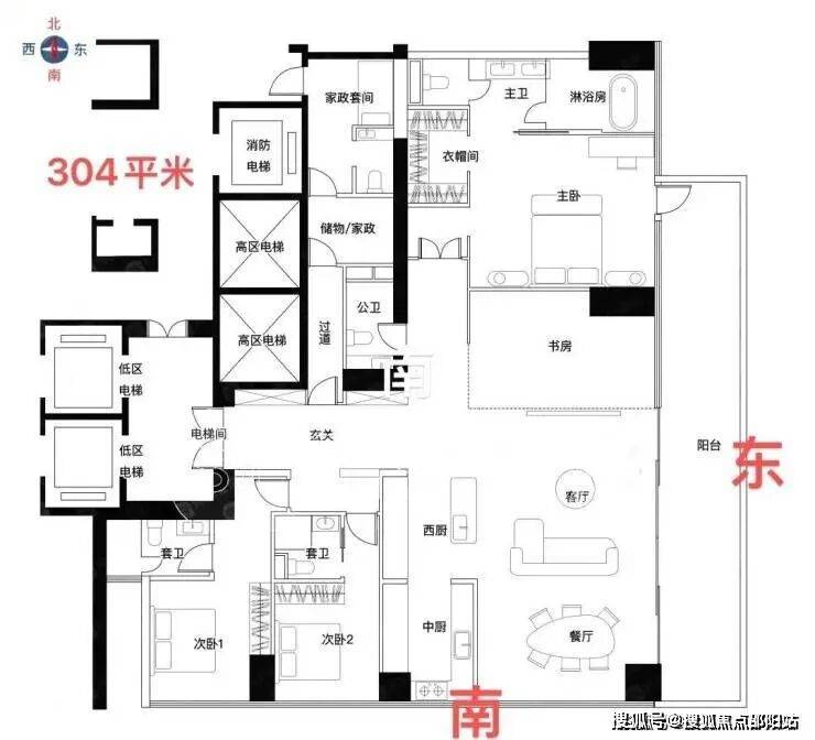 305㎡户型是整个中低区里面朝向最好的户型,主朝向为东和南。东边是长约16米宽2.4米的大阳台,南面则是约17米宽的纯落地窗,不论是采光日照都非常优秀。