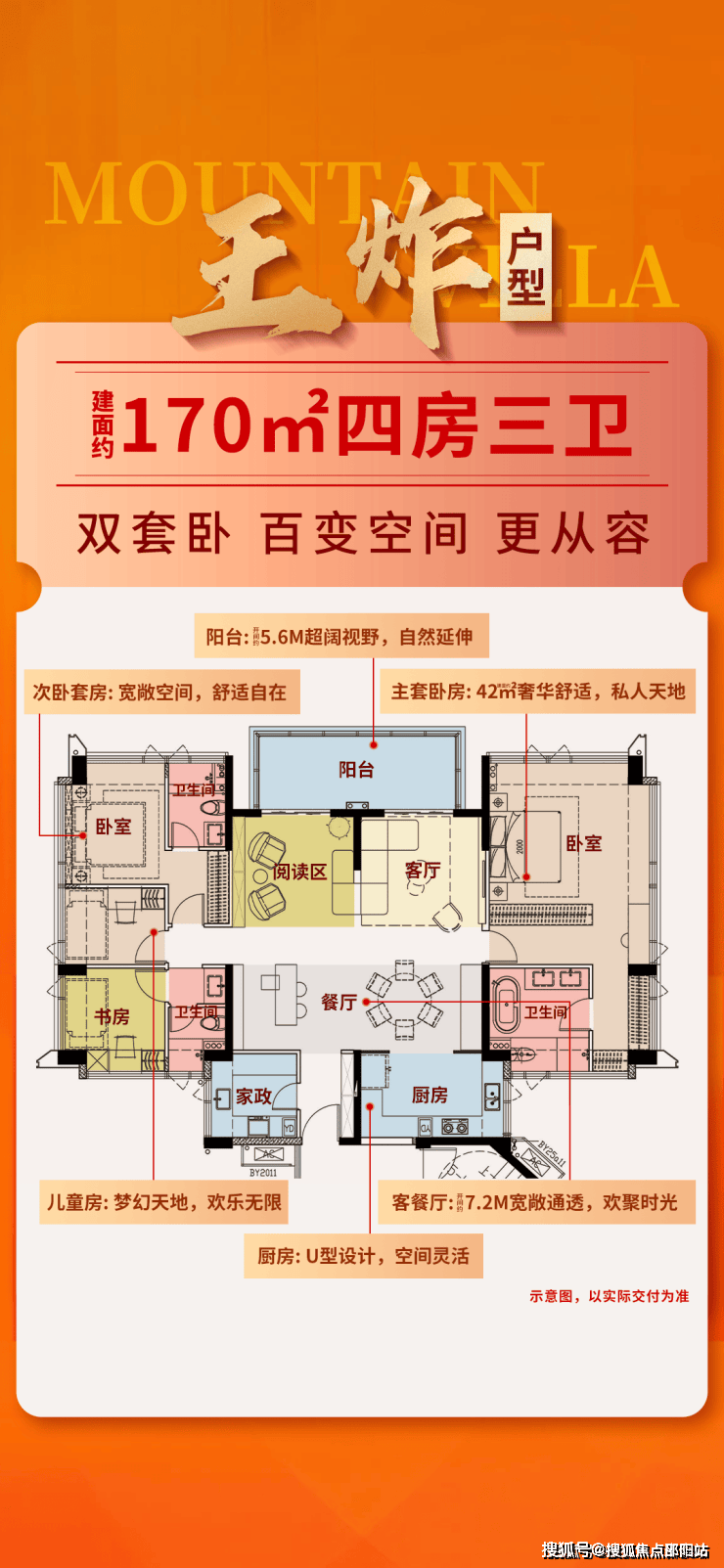 建面约170m²百变双套卧4房3卫:开间约7.2m宽敞通厅/约42m²奢华套卧