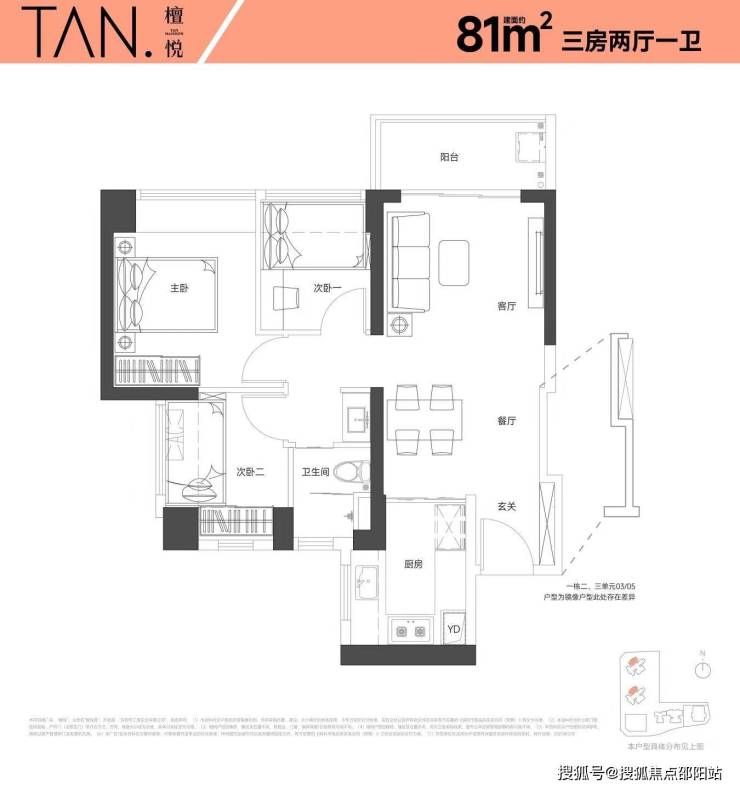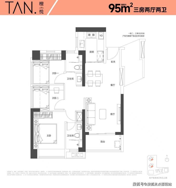 户型面积布局295平三房两厅两卫采用了竖厅布局,入户玄关宽敞明亮,客厅开间为3.55米,LKDB一体化设计确保了空间的高效利用,动静分区明确,一个次卧配备双飘窗,U型厨房操作便捷,卫生间三段式分离,得房率同样为74.34%(不含赠送),东南朝向确保了充足的阳光。