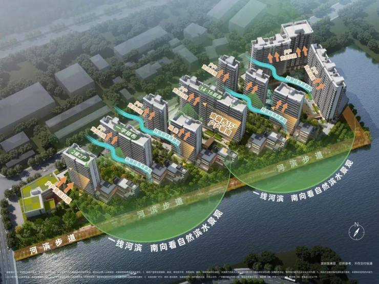 户型排布从石榴岗河自东向西依次升高,保证了约300米宽的生态水景面。