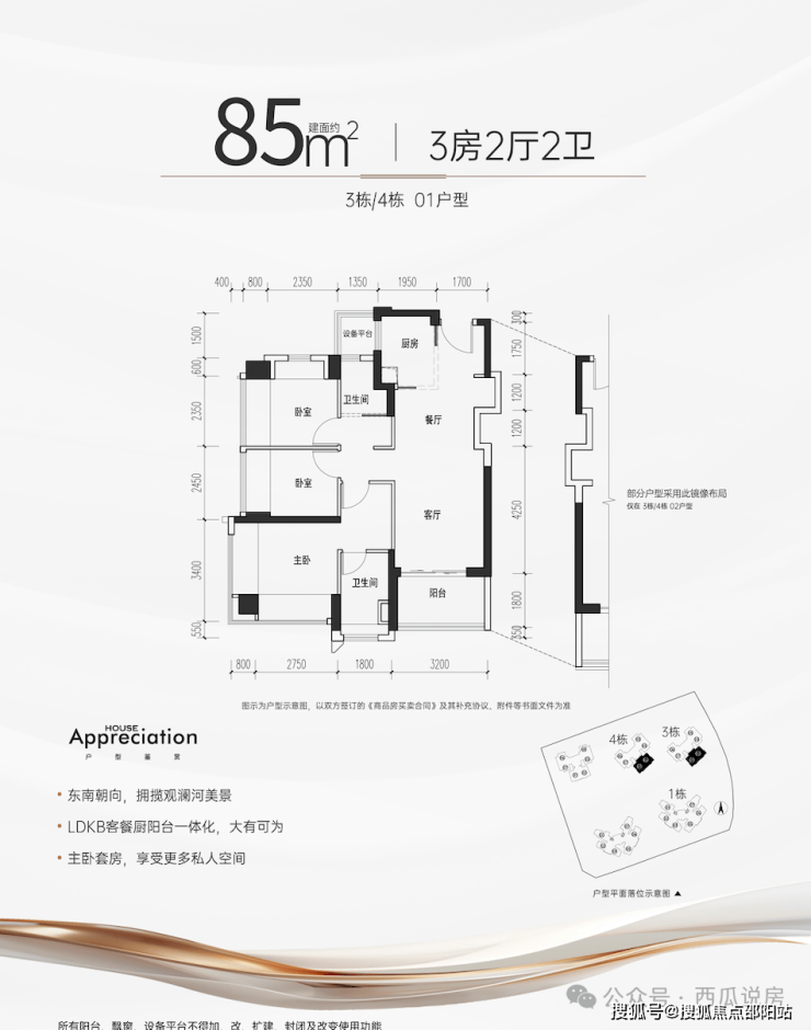 85㎡的3房2厅2卫,设计的是竖厅格局,客厅3.2米开间,三开间朝南,3个卧室分别做到了主卧16.41㎡/次卧7.71㎡/次卧7.4㎡(包含墙体飘窗),公卫带2㎡的设备平台,得房率约:97%(包含赠送),东南朝向看观澜河景观。
