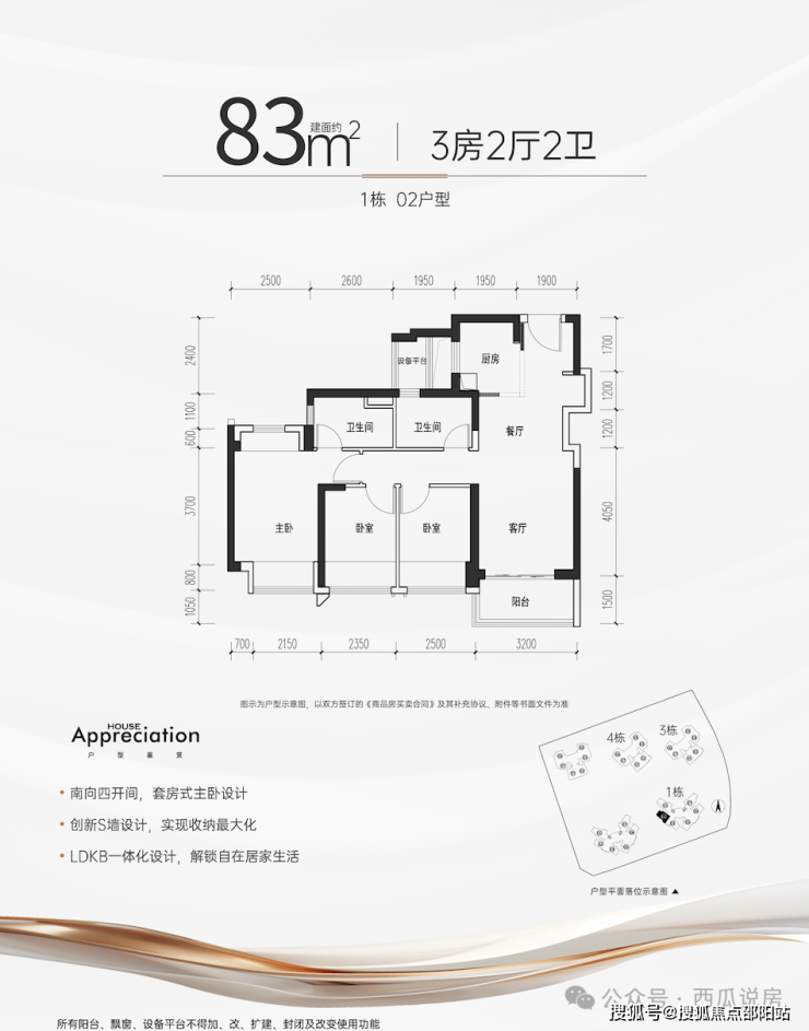 83㎡的3房2厅2卫,设计的是经典竖厅格局,客厅3.2米开间,,四开间朝南,S墙设计预留冰箱卡槽位,3个卧室分别做到了主卧11.97㎡/次卧8.75㎡/次卧8.22㎡(包含墙体飘窗),公卫带1个4.68㎡的设备平台,得房率约:97%(包含赠送),西南朝向。