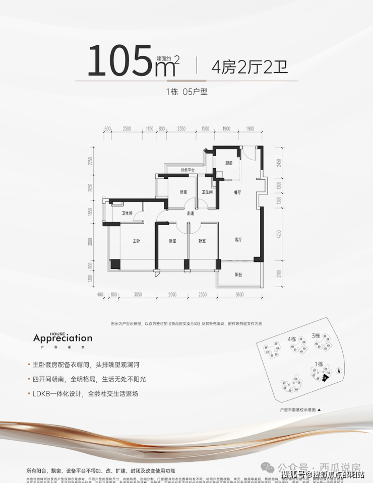 105㎡的4房2厅2卫,设计的是经典竖厅格局,客厅3.6米开间,四开间朝南,4个卧室分别做到了主卧17.59㎡/次卧9.5㎡/次卧8.93㎡/次卧7.75㎡(包含墙体飘窗),公卫带1个3.12㎡的设备平台,得房率约:100%(包含赠送),东南朝向看观澜河景观。