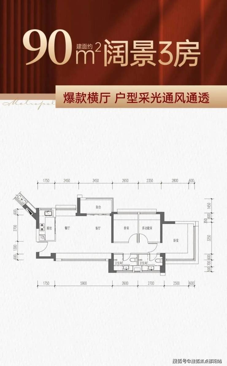 90㎡的3房2厅2卫,南北通大横厅户型,动静分区全明户型,U型厨房,餐客厅一体,客厅开间约5.9米,三个房间和客厅都带大飘窗,主卧双飘窗带独立卫生间。