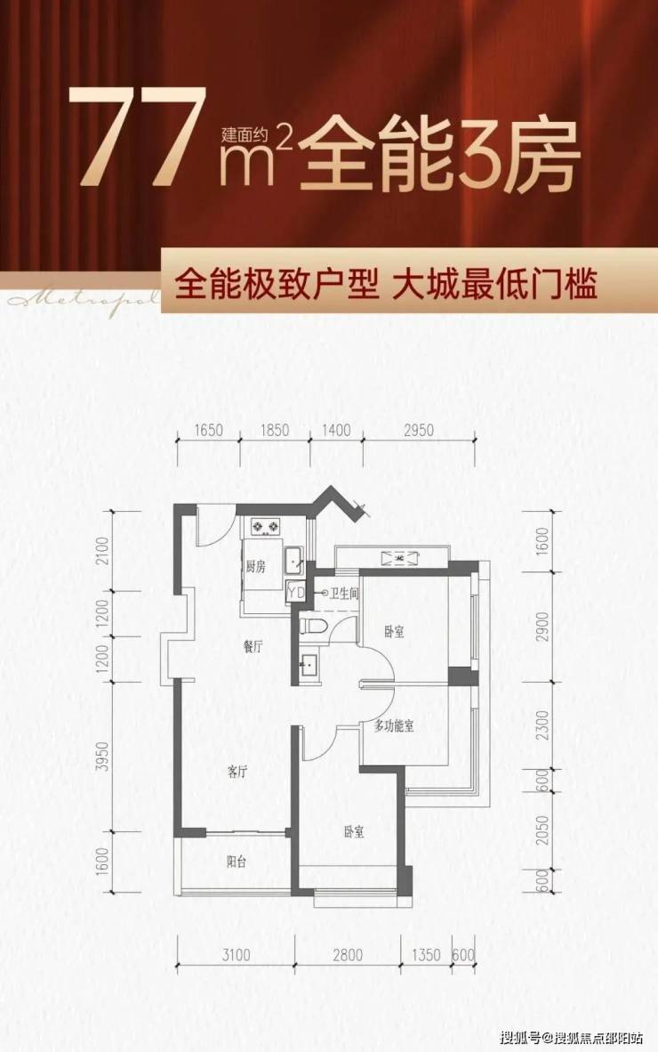 77㎡的3房2厅1卫,经典的竖厅户型,动静分区,S型冰箱位,餐客厅一体,客厅开间约3.1米,三个房间其中一个次卧和主卧都是双飘窗。