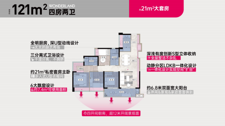 约121平四房是改善客户的好选择,同样拥有全屋多飘窗、S型收纳等优点,主卧尺寸更继续升级,自带衣帽间空间;