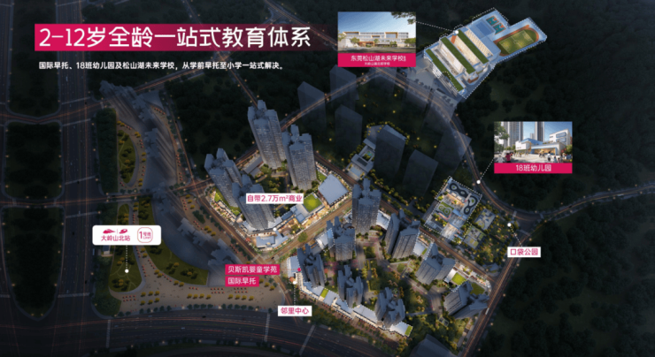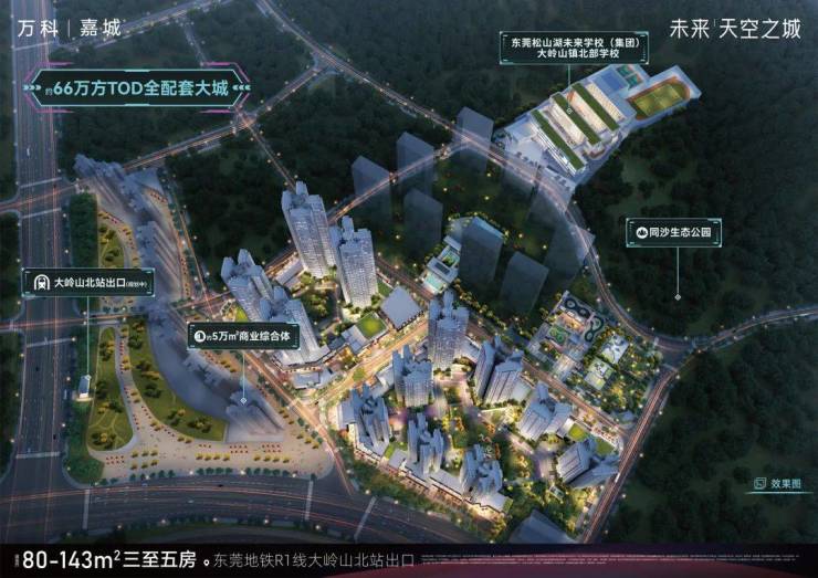 大岭山新盘万科嘉城·未来天空之城项目位于大岭山北站TOD,规划约66万平的体量,打造一座能代表城市的TOD未来超级生活大城。在项目旁边,是东莞松山湖未来学校教育集团成员之一的大岭山镇北部学校,据悉,该学校为公立小学,由未来天空之城项目配建。