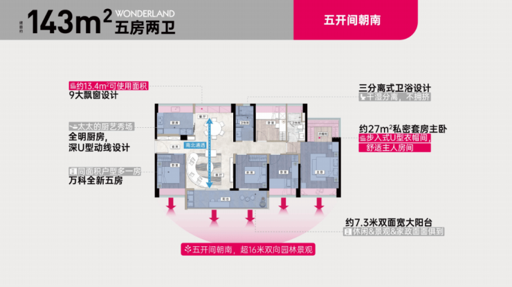 再如约143平户型做出了5房产品,还实现南北“全面屏采光”,四代同堂家庭也能一步到位,每个家庭成员都有自己的专属空间。