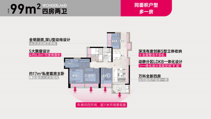 不到百平的空间,即可拥有四开间朝南、约11米南向景观面的瞰景享受;全屋还有约6.8平的飘窗,进一步拉高空间使用率。