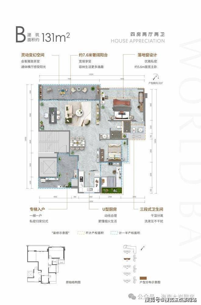 B户型: 约131㎡四房两厅两卫、层高23层