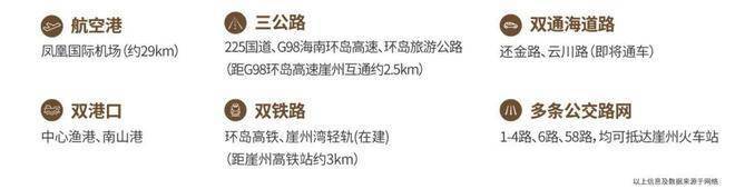 【轨道】距离崖州动车站约3.6公里,崖州动车站至三亚凤凰机场9分钟,至三亚火车站14分钟。城际轨道交通已建成,待投入使用(三亚至乐东方向,5分钟/班,直达机场、连接动车站)