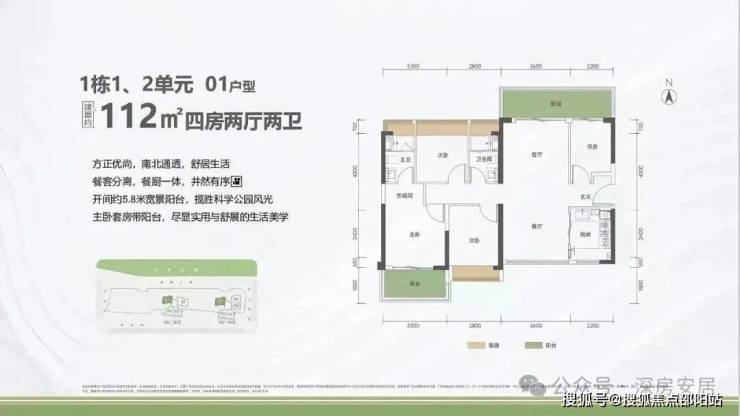 112㎡的4房2厅2卫,1栋1/2单元01户型,设计的是竖厅南北通透格局,进门入户玄关,客厅3.6米开间,餐客分离,餐厨一体设计,四开间朝南,主卧套房带阳台,客厅连接次卧出5.8米长的巨幕大阳台,U型厨房,卫生间干湿分离,阳台主朝东北向看科学公园。