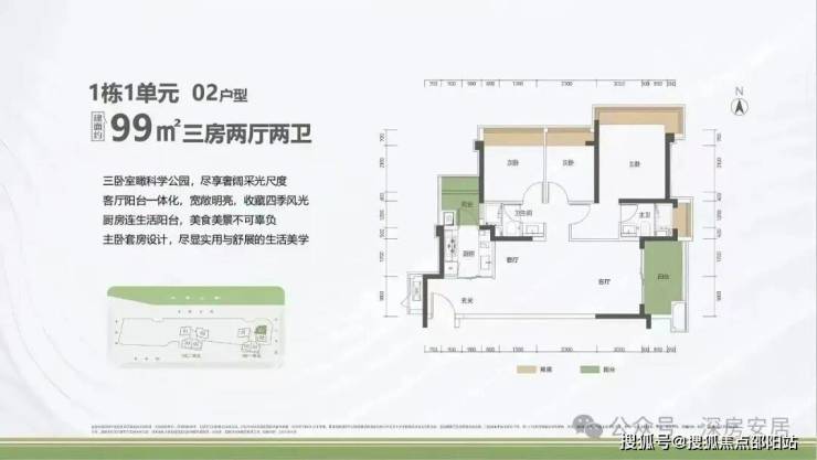99㎡的3房2厅2卫,1栋1单元02户型,设计的是竖厅格局,客厅3.5米开间,LDKB一体化设计,进深11.31米,动静分区,三卧室朝东北向看科学公园,二字型厨房还带1个生活阳台,公卫三段式分离,阳台1.5米进深,东南朝向。