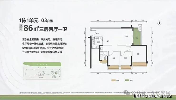 86㎡的3房2厅1卫,1栋1单元03户型,设计的是竖厅格局,客厅3.5米开间,LDKB一体化设计,进深9.95米,主卧全朝南,动静分区,U型厨房,卫生间三段式分离,阳台1.5米进深,东南朝向。