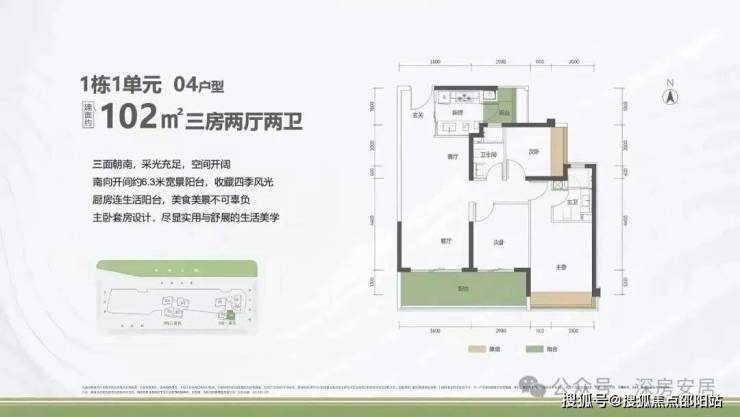 102㎡的3房2厅2卫,1栋1单元02户型,设计的是经典竖厅格局,进门入户玄关,客厅3.5米开间,LDKB一体化设计,三开间朝南,动静分区,客厅连接次卧出6.3米长的巨幕大阳台,二字型厨房还带1个生活阳台,卫生间干湿分离,西南朝向。