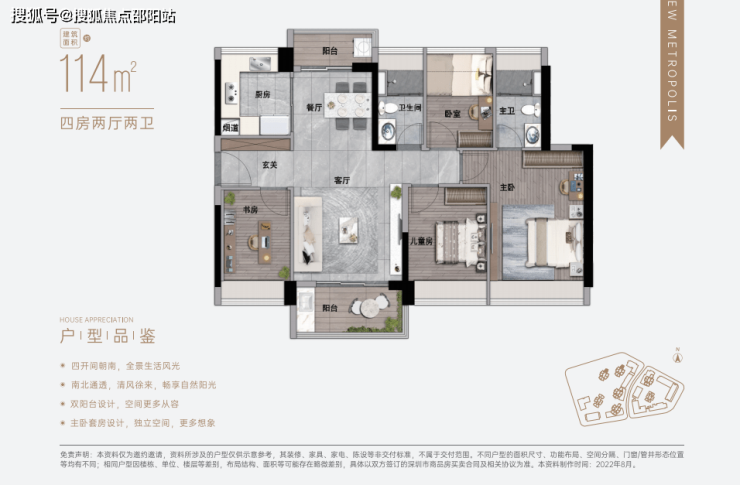 项目还有建面约114㎡的四房两厅两卫户型。南北双阳台、四开间朝南,真正的南北通透。