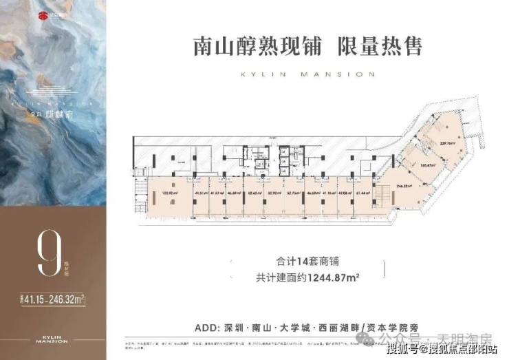 9栋M层为14套商铺,共计1244.87 ㎡;其中01-02-03铺为挑高铺; 整体为2层铺;