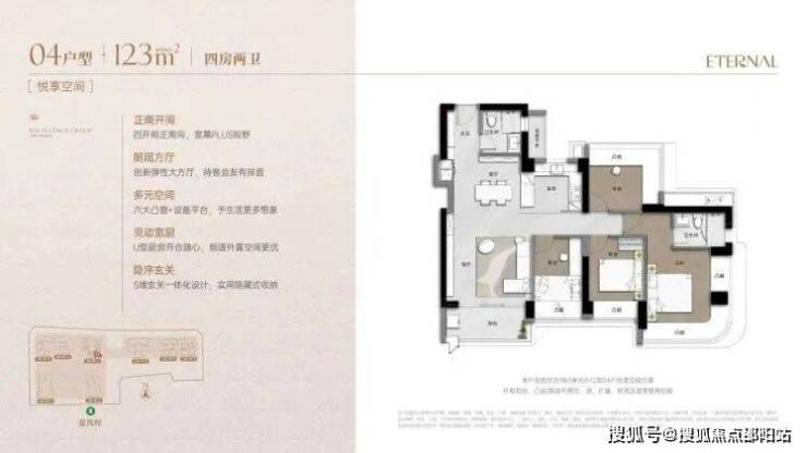 123㎡的4房2厅2卫,折后总价1182-1345万/套,单价9.56-10.87万/㎡。