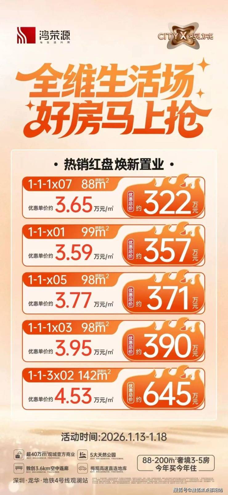 在深圳“北拓”战略的推动下,龙华观澜正成为城市发展的新引擎。作为鸿荣源集团继“壹成中心”后的又一巨作,鸿荣源观城以总建面超300万㎡的体量,打造集住宅、商业、办公、教育、文体于一体的超级综合体。项目首期产品即将入市,主推建面88-143㎡三至四房,总价350万起,以“全能配套+价格洼地”优势抢占市场焦点。