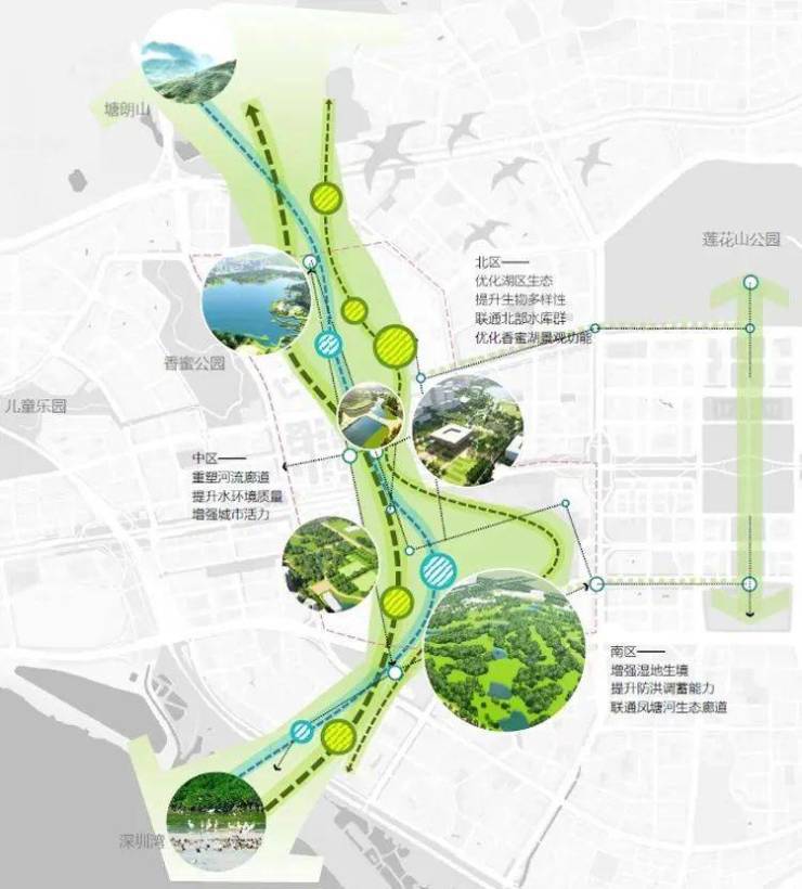 区域内,还规划打造香蜜湖水廊,一直通向深圳湾,沿水廊建成城市公园、绿道和城市慢行道,高尔夫球场西侧约1/3的面积也纳入这个规划,将建成体育公园。
