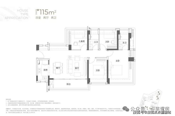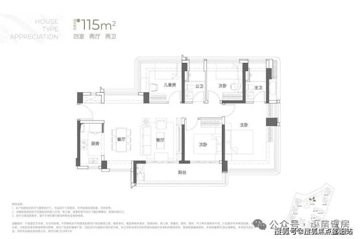 115㎡的4房2厅2卫:户型分布于1/2栋,东南、西南朝向,横厅户型但是能做到南北通,赠送率最高的户型,2栋1单元户型差异这在阳台位置的设置上。