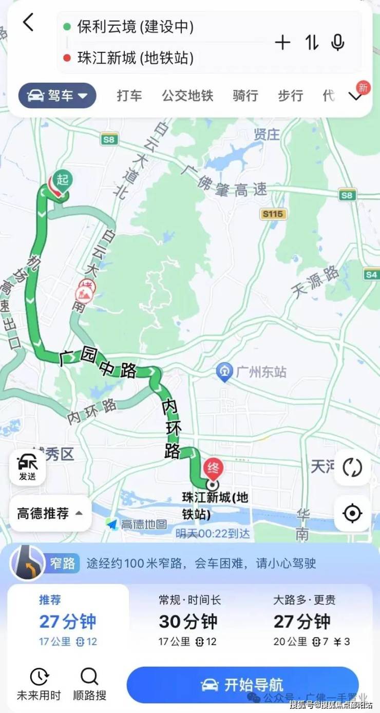 相较于小区距离地铁过远,驾车就方便很多,导航软件显示从楼盘出发,不堵车驾车27分钟就可以到珠江新城了。