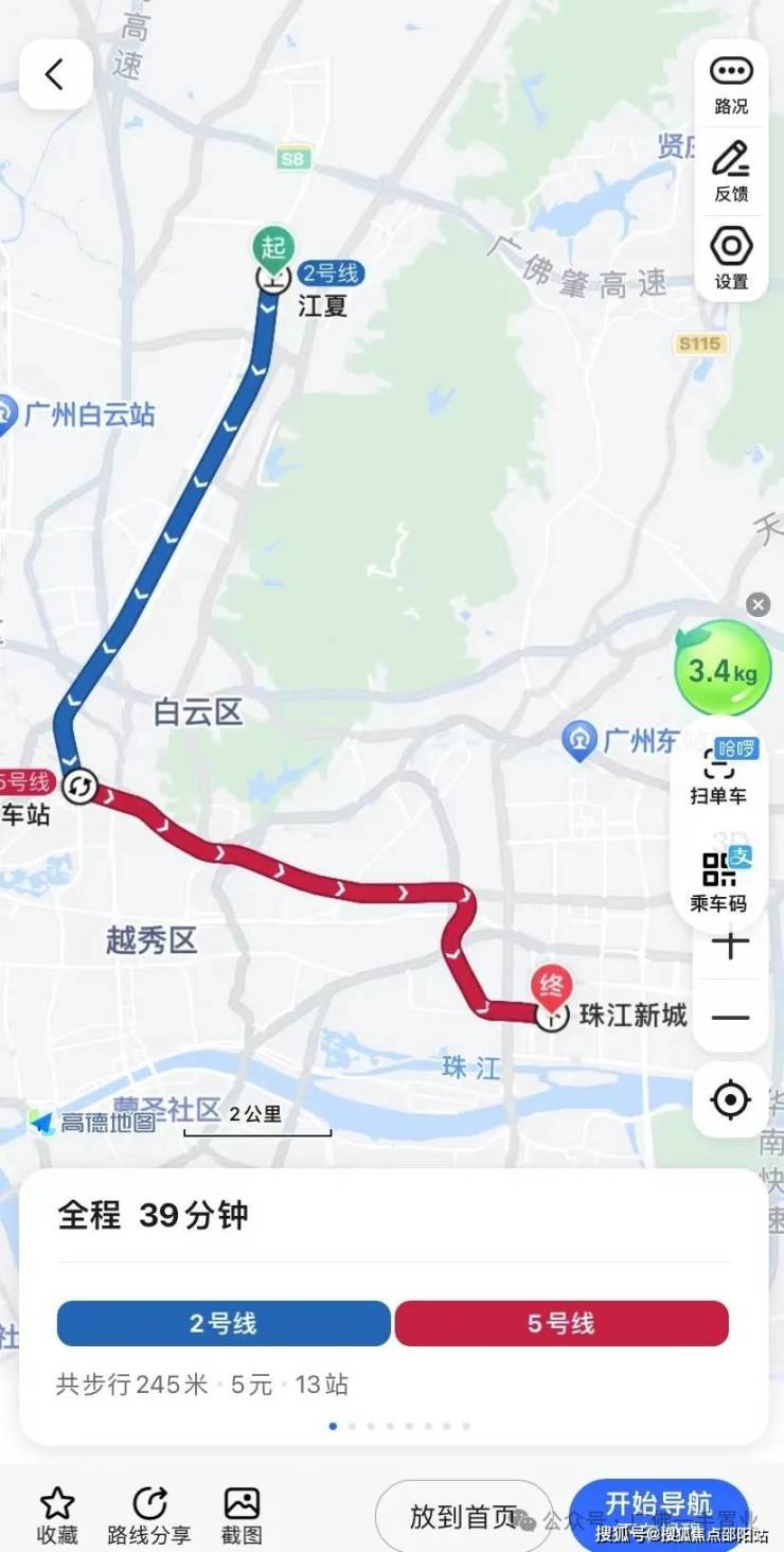 从江夏站出发需要中途换乘5号线,总共13个站,耗时39分钟就可以到珠江新城。