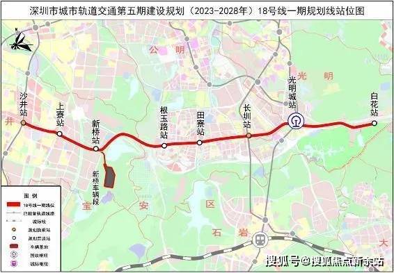 18号地铁线,这是一条东西向的地铁线路,规划串联宝安海洋新城、光明城、观澜、平湖金融城,全长61.6公里,设站27座,其中一期工程沙井站-白花站,设站8座,全部为地下站,设计时速120公里,