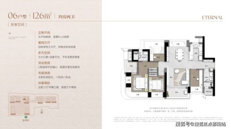采用双龙抱珠格局,灵活适配成长型家庭。LDKB一体式布局,配备270°环幕主卧套房、U型厨房及七大飘窗,空间动静分离,实用且可变。