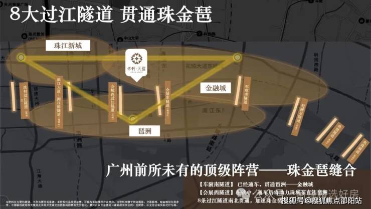 未来将串联起珠江新城——金融城千亿配套,保利天曜将成为花城大道上豪宅新选择。珠城、金融城-琶洲(南北向):政府规划8条过江隧道,目前已建成车陂南隧道,项目东边会展西隧道预计2026年通车(消息来源:广州日报)