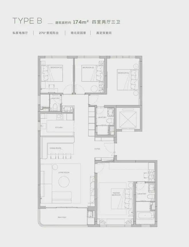 • 174㎡四房三卫:端户边厅设计,270度环幕观景阳台,主次双套房配置。