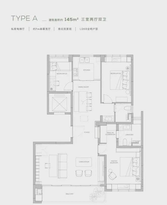• 145㎡三房两厅两卫:餐厨一体化设计,7.1米南向宽厅,LDK全明布局,适合年轻家庭。
