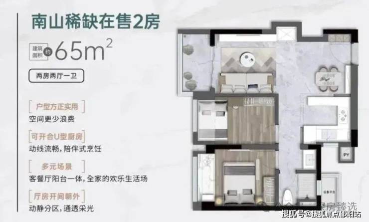 珑秀公馆65平格局非常方正,从入门、餐厅到阳台都比较规整,动态流畅,动静分区也明显。