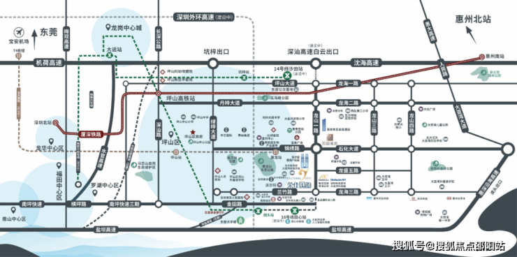 此外,项目被251米慧聪双子塔(建设中)、206米五星级喜来登酒店(建设中)等6座超高层环绕;坐拥2铁1轨难得的地脉黄金圈,近享地铁14号线沙田站(预计2022年通车)、16号线田心站(预计2023年通车)、深大城轨聚龙山站(建设中)。