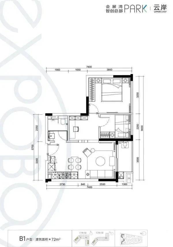 【B1户型:72㎡】房型:2+1房一厅一卫朝向:E1、E2(西北、东南)