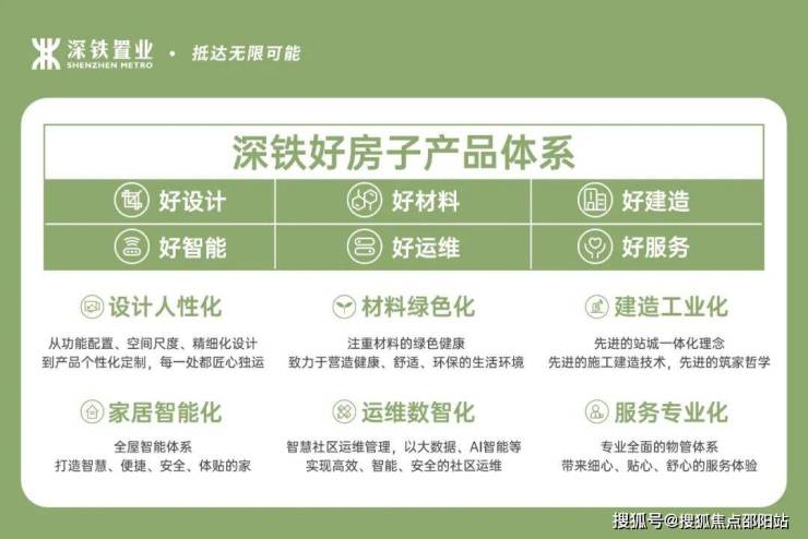 深铁置业”深入贯彻落实全国住房城乡建设工作会议精神,以精工细作“好房子”为使命,全力推动好设计、好材料、好建造、好智能、好运维、好服务的“六好”建设,以设计人性化、材料绿色化、建造工业化、家居智能化、运维数智化、服务专业化为特点,严格把控各个环节和指标。集团依托企业优势和群众需求,匠心构建了“好房子”企业标准体系,在该体系的引领下,不断超越行业标准,打造具有世界视野,蕴含中国文化,具备湾区特色,饱含深铁情怀的“好房子”。