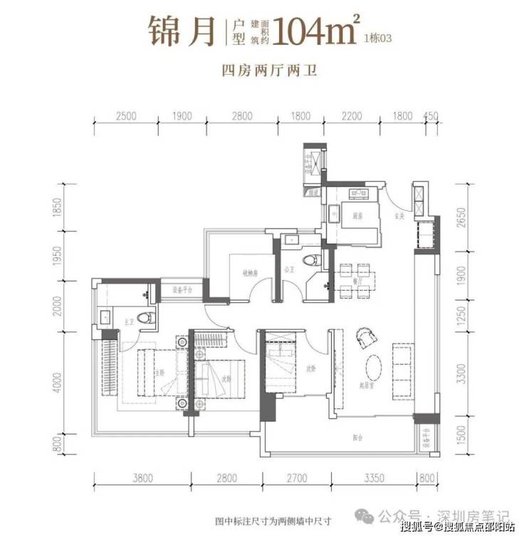 104-107㎡ 4房总价467-527万,单价4.47-4.98万/㎡;