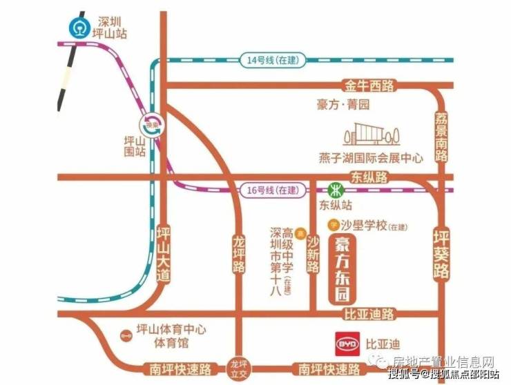 豪方东园处在整个坪山的南侧,临比亚迪路,位于比亚迪股份有限公司的正对面,距离在建地铁16号线东纵站地图所示地铁口直线距离约500米,步行距离约800米。地铁16号线预计2023年7月开通,经4站到坪山围与地铁14号线换乘。