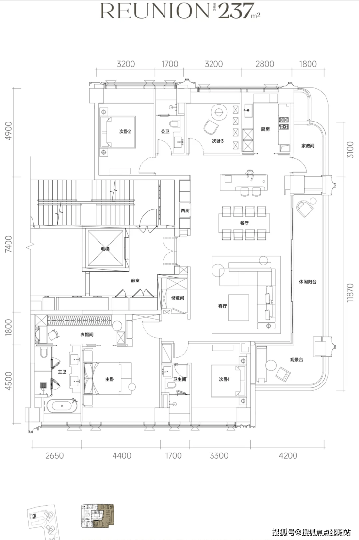 237㎡4+1房3卫户型阳台达11.8米,采用270°全景阳台最大化采光和观景效果,功能分区做得很好。采用一户一梯专梯入户,南北通透结构,是整个南山里非常稀缺的户型
