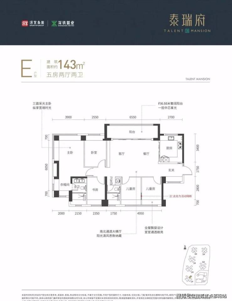 143㎡的5房2厅2卫,设计的是横厅南北通透格局,进门入户玄关,客餐厅6.55米开间,四开间朝南,5个卧室分别做的3.9米/2.55米/2.48米/2.47米/2.35米/的宽度,U型厨房,公卫三段式分离,得房率:77.48%(不含赠送),阳台主朝东南或西南向。