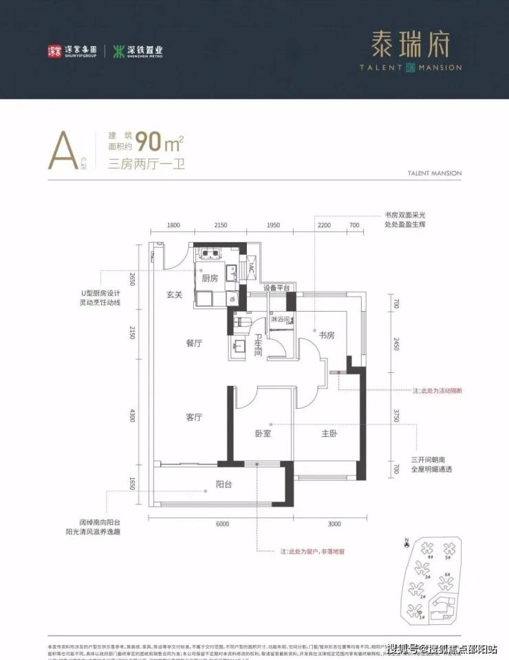 90㎡的3房2厅1卫,设计的是竖厅格局,进门入户玄关,客厅3.3米开间,三开间朝南,3个卧室分别做的3米/2.9/2.6米的宽度,客厅连接次卧出6米长大阳台,U型厨房,创新式卫生间分离设计,得房率:77.48%(不含赠送),西南或东南朝向。