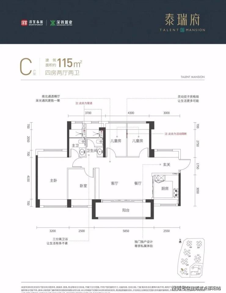 115㎡的4房2厅2卫,设计的是横厅南北通透格局,进门入户玄关,客餐厅5.85米开间,四开间朝南,4个卧室分别做的3.2米/2.5米/2.15米/2.15米的宽度,主卧南北通透设计,U型厨房,公卫三段式分离,得房率:77.48%(不含赠送),阳台主朝西南或东南向。