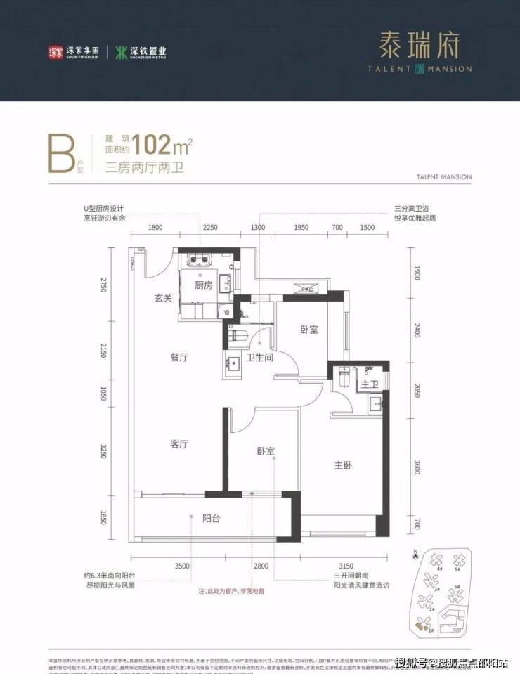 102㎡的3房2厅2卫,设计的是竖厅格局,进门入户玄关,客厅3.5米开间,三开间朝南,3个卧室分别做的3.15米/2.8米/2.65米的宽度,客厅连接次卧出6.3米长大阳台,U型厨房,卫生间三段式分离,得房率:77.48%(不含赠送),西南或东南朝向。
