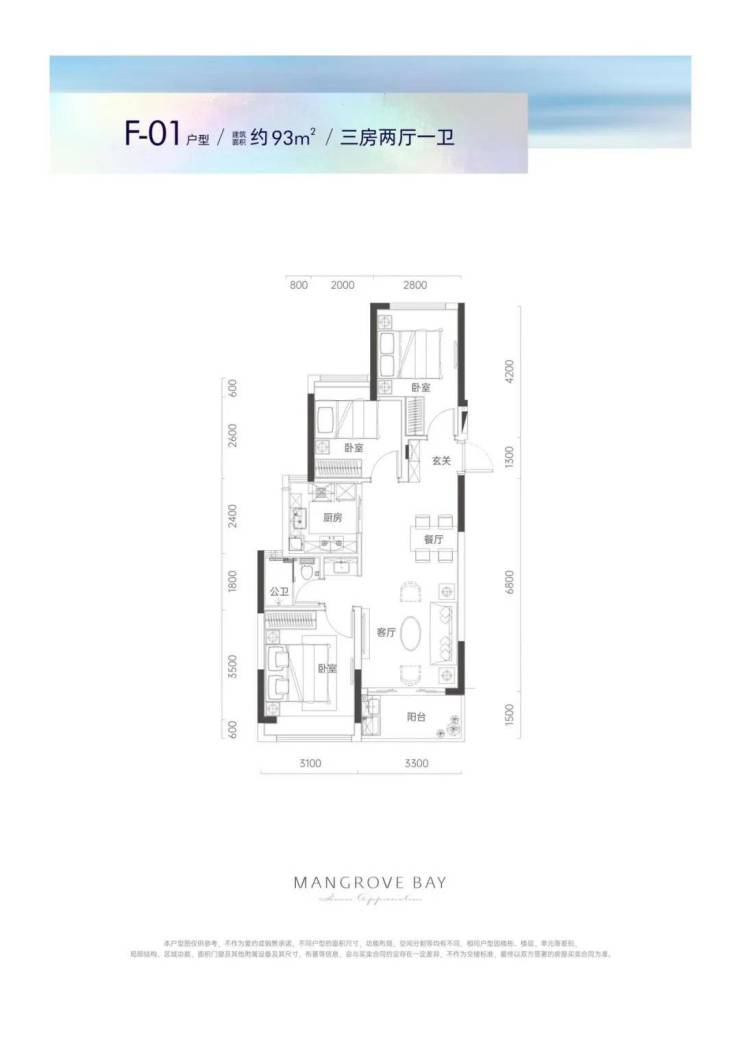 A02户型76平2房2厅1卫:房间和客厅朝南向,采光充足;约5.8米开阔观景阳台,俯瞰红树林自然生态;动静干湿自然分离,生活有序互不干扰。F01户型93平3房2厅1卫:客厅、餐厅连通阳台,自然采光充足;宽景竖厅,空间开阔;主卧独立卫生间,隐私雅奢生活;动静干湿分离。G01户型112平3房2厅2卫:同样拥有客厅、餐厅连通阳台的设计,自然采光充足;全屋飘窗,尽享超大采光面;主卧独立卫生间;动静干湿分离。C03户型134平4房2厅2卫:方正紧凑格局,合理精研每一寸空间;独立私家书房;约6.6米宽阔景观阳台;客厅、餐厅连通阳台;主卧飘窗。